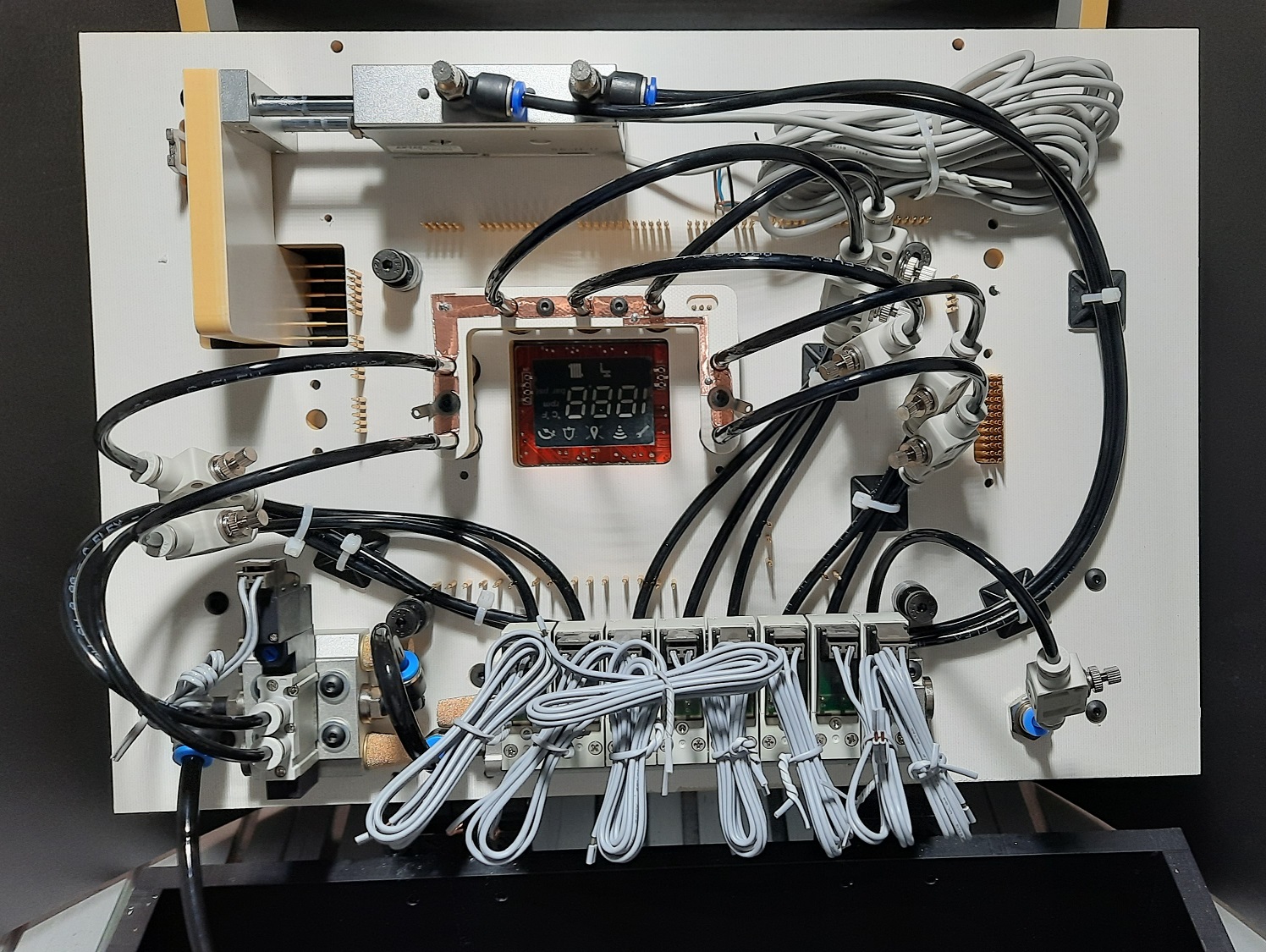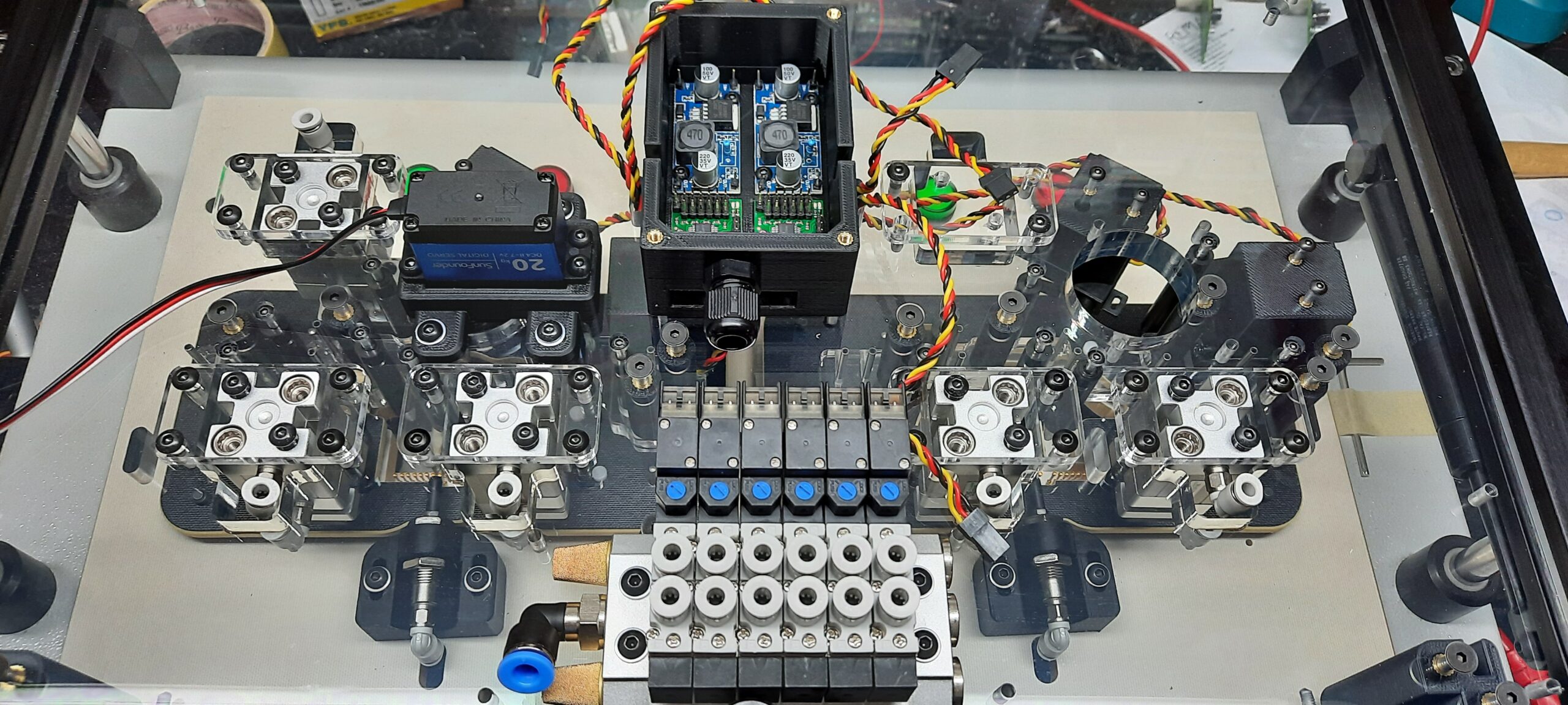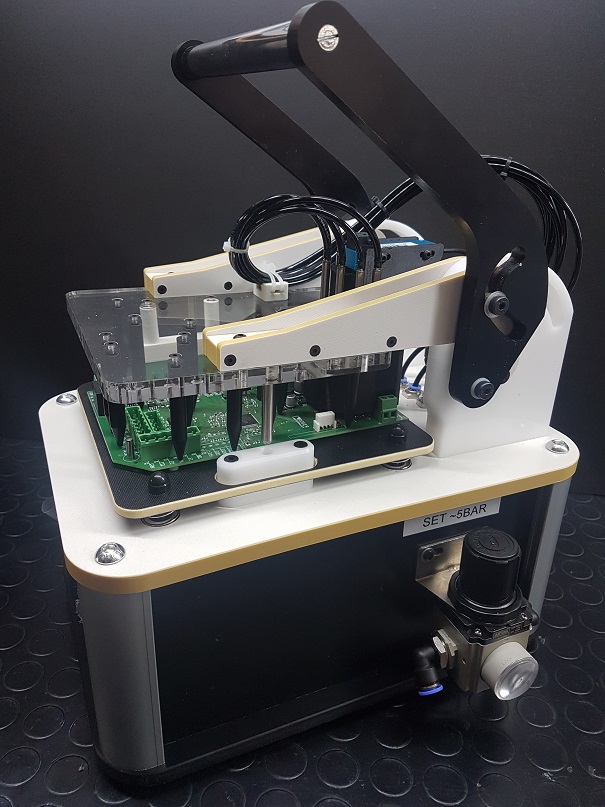 Fixture FCT completamente automatica con pneumatica e servocomandi per posizionamento selettori