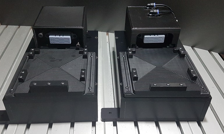 Fixture FCT a doppia postazione per due prodotti indipendenti, Hardware di comando a pannello, sicurezze elettro-meccaniche in apertura.